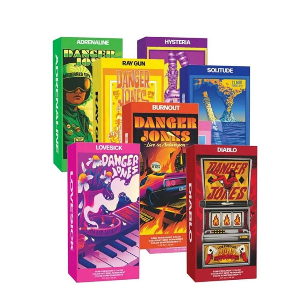 La coloration semi-permanente Danger Jones offre 25 nuances vibrantes. Toutes les couleurs sont mélangeables pour des résultats de couleurs personnalisés. Sa texture crémeuse unique facilite l'application et la saturation des cheveux, ce qui signifie que vous utilisez moins de produit pour obtenir une couverture complète. De plus, toutes les couleurs sont hautement pigmentées, ce qui leur donne un éclat audacieux. Même les pastels ont du cran.