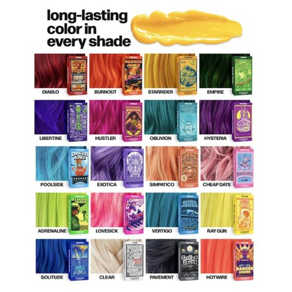 Danger Jones semi-permanent hair color offers 25 vibrant shades. All colors are mixable for personalized color results. Its unique creamy texture makes it easier to apply and saturate hair, which also means you use less product to achieve full coverage. Plus, all colors are highly pigmented, giving them a bold shine. Even pastels have guts.