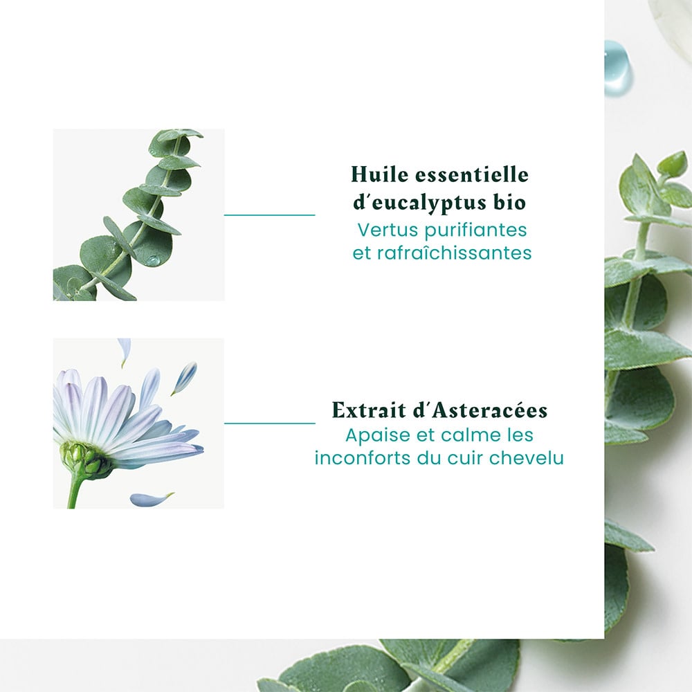 Enriched with cold essential oils of mint and eucalyptus, it offers an intense feeling of freshness that immediately relieves itching and feelings of tightness. Thanks to its 10x higher content of soothing asteraceae extract, this concentrate has anti-inflammatory properties that help calm the scalp and reduce redness.