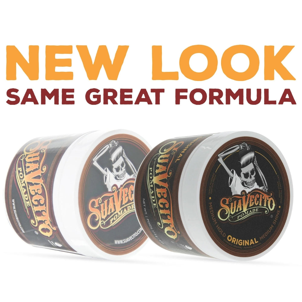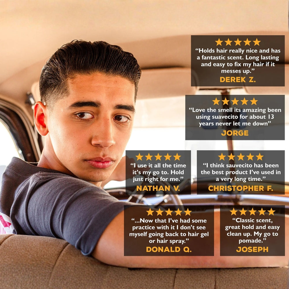 Suavecito’s Original Hold Pomade. This is a uniquely scented styling water based product that is formulated to keep your hair in place all day long. It combs into your hair easily with it’s creamy consistency and provides a strong grip for a slick back, pompadour, side part or any hairstyle you are rocking. This pomade is water-soluble, washing out with no effort using only water leaving your hair feeling untouched. No special shampoos...