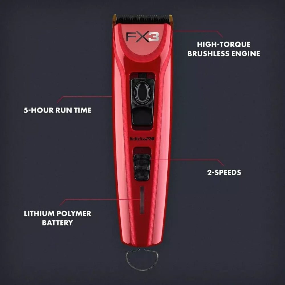 La collection FX3 est la 3ème génération de produits Ferrari de BaByliss PRO. Chaque article est doté de moteurs avancés à couple élevé, de boîtiers européens ergonomiques ultra-élégants et d'une surface de préhension à texture de carbone intégrée unique. La collection BaByliss PRO FX3 est la combinaison ultime de Puissance, Design et Performance de coupe.