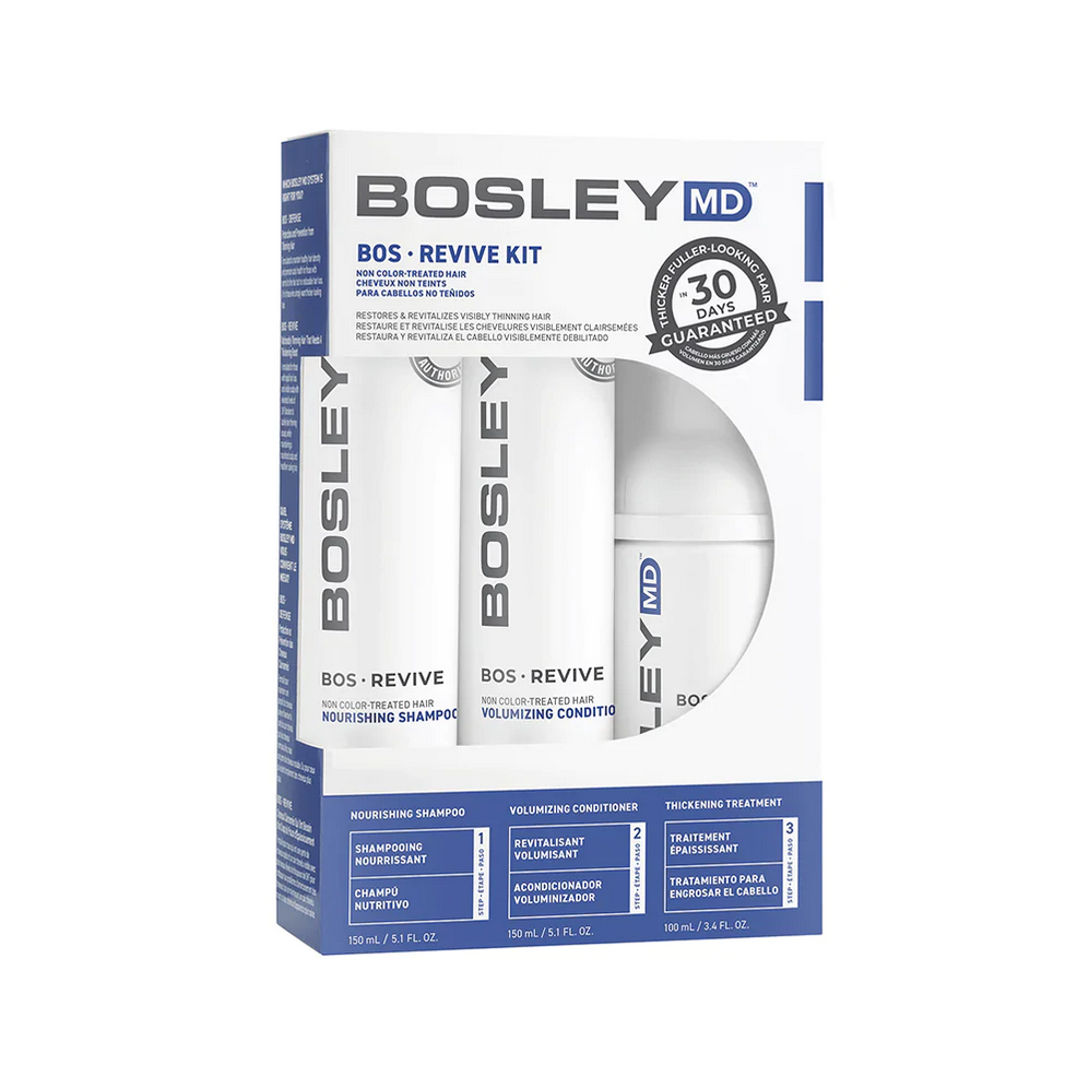 Le trio volumisant "BosRevive" de Bosley est un ensemble de départ de 30 jours conçu pour aider à restaurer les cheveux visiblement clairsemés, naturels et non teints. Il s'attaque à la dihydrotestostérone (DHT), un facteur connu pour contribuer à la perte de cheveux.