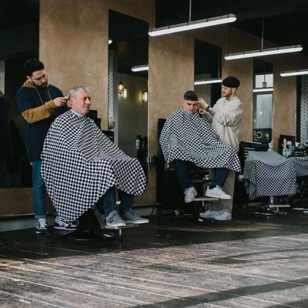 La Cape de barbier professionnel "Houndstooth" de Cape Gang, est conçue en utilisant des matériaux sur mesure de haute qualité et une impression par sublimation.