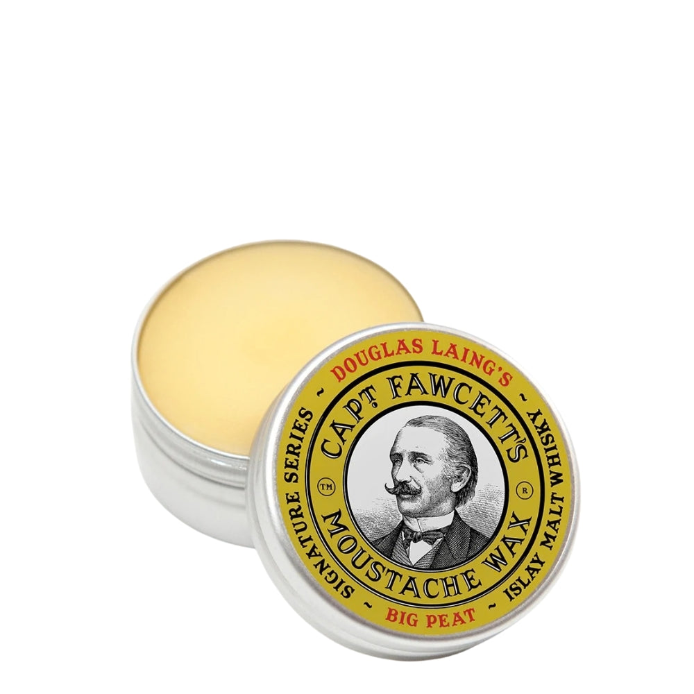 Le capitaine Fawcett a récemment reçu une délicieuse demande de son cher ami Douglas Laing Esq, le célèbre mélangeur de renommée mondiale des meilleurs whiskies écossais. Absolument ravi du superbe résultat, le capitaine a décidé d'ajouter la cire à moustache "Big Peat Whisky" à son collection de produits de toilette pour gentleman de première classe.