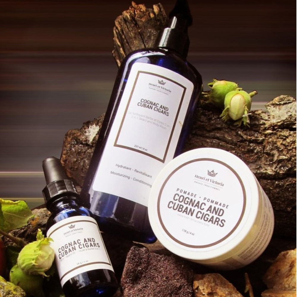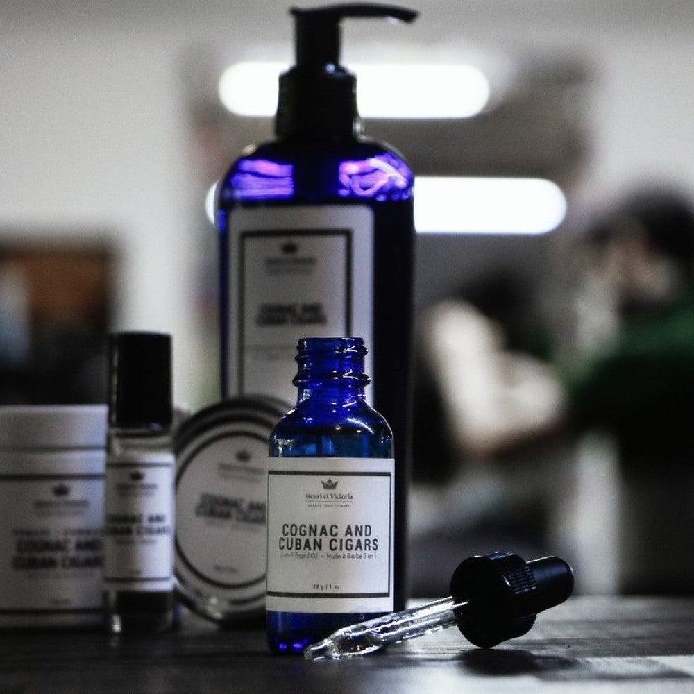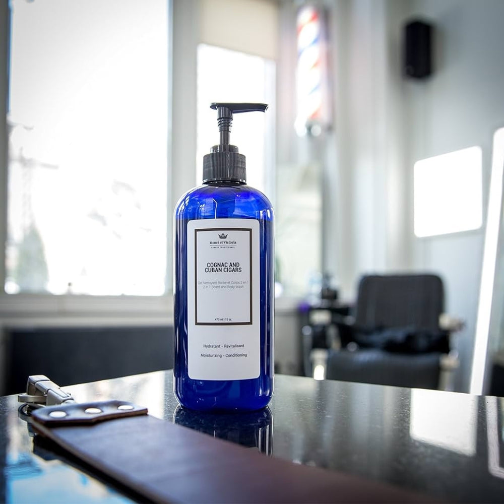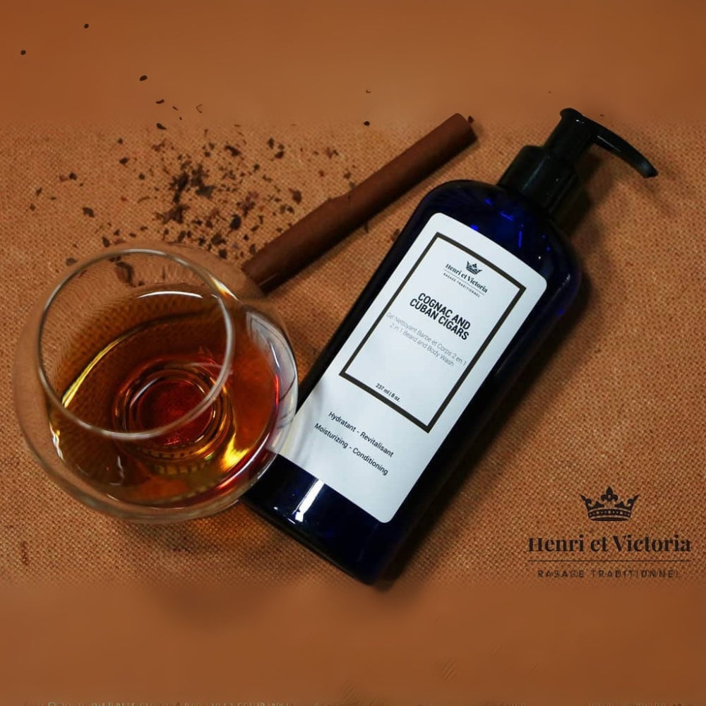 Le gel nettoyant 2 en 1 "Cognac and Cuban Cigars" d'Henri et Victoria s'utilise sur la barbe, le corps et les cheveux. Ce nettoyant pour le corps et la barbe procure un double lavage corporel et peut même fonctionner comme shampoing.