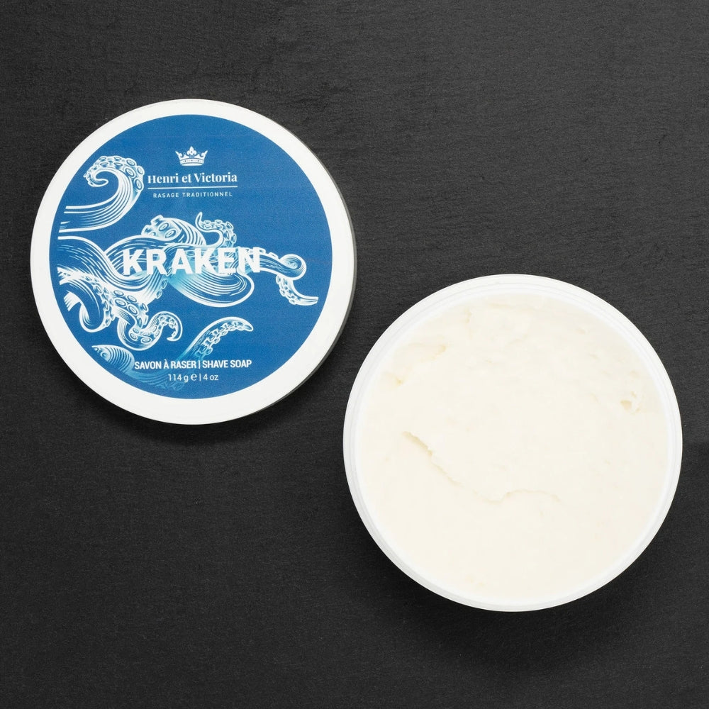 Le savon à raser "Kraken" de Henri et Victoria, un indispensable du toilettage traditionnel pour chaque homme qui savoure le plaisir d’un rasage humide classique.