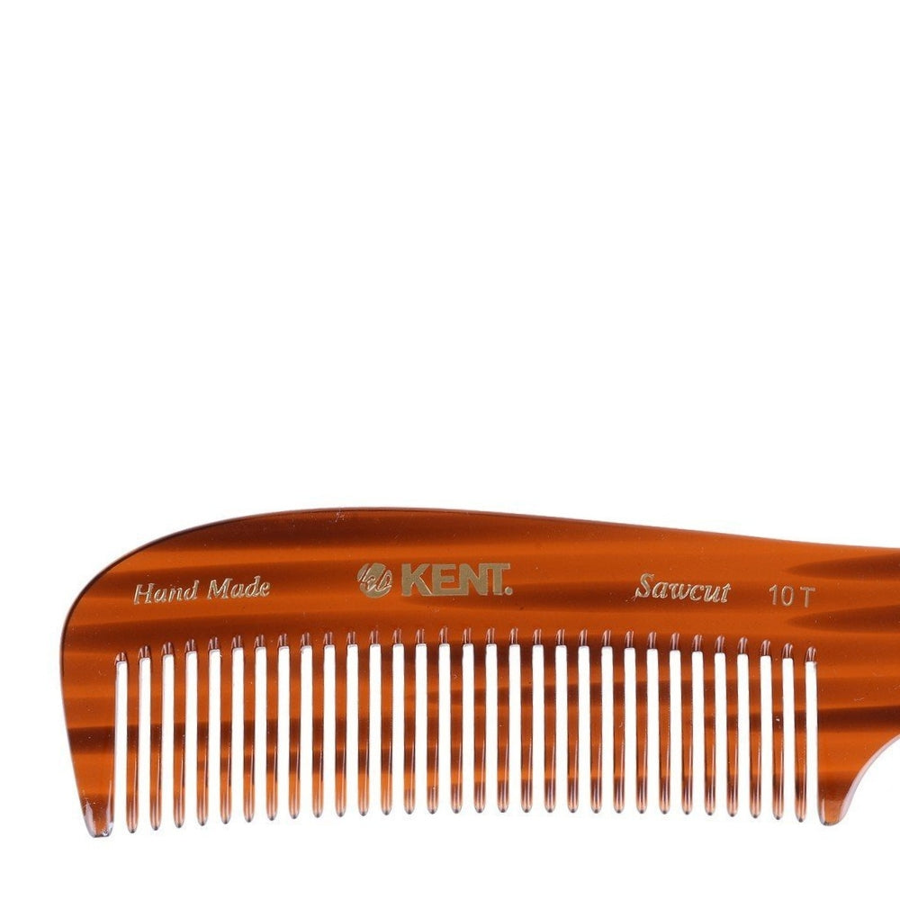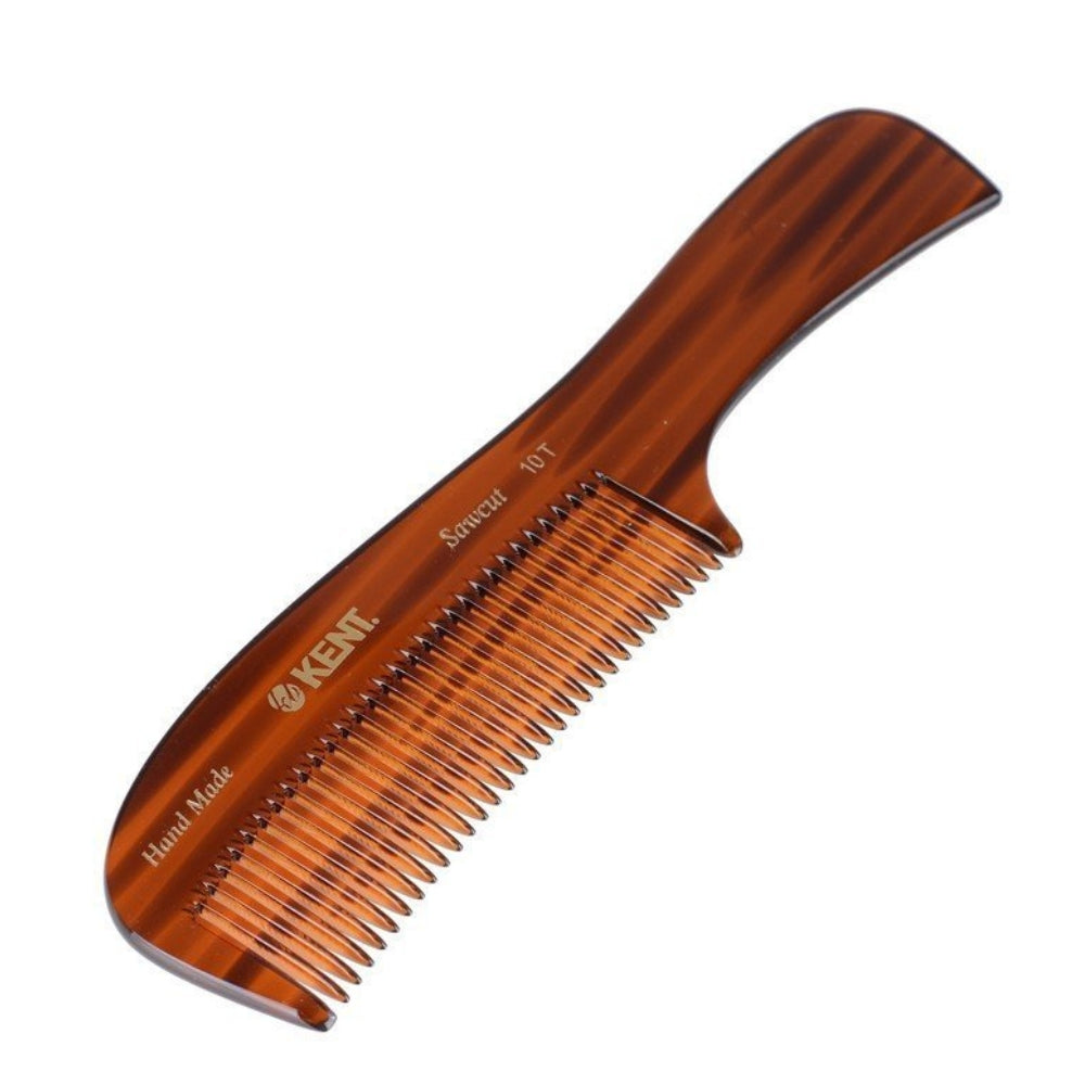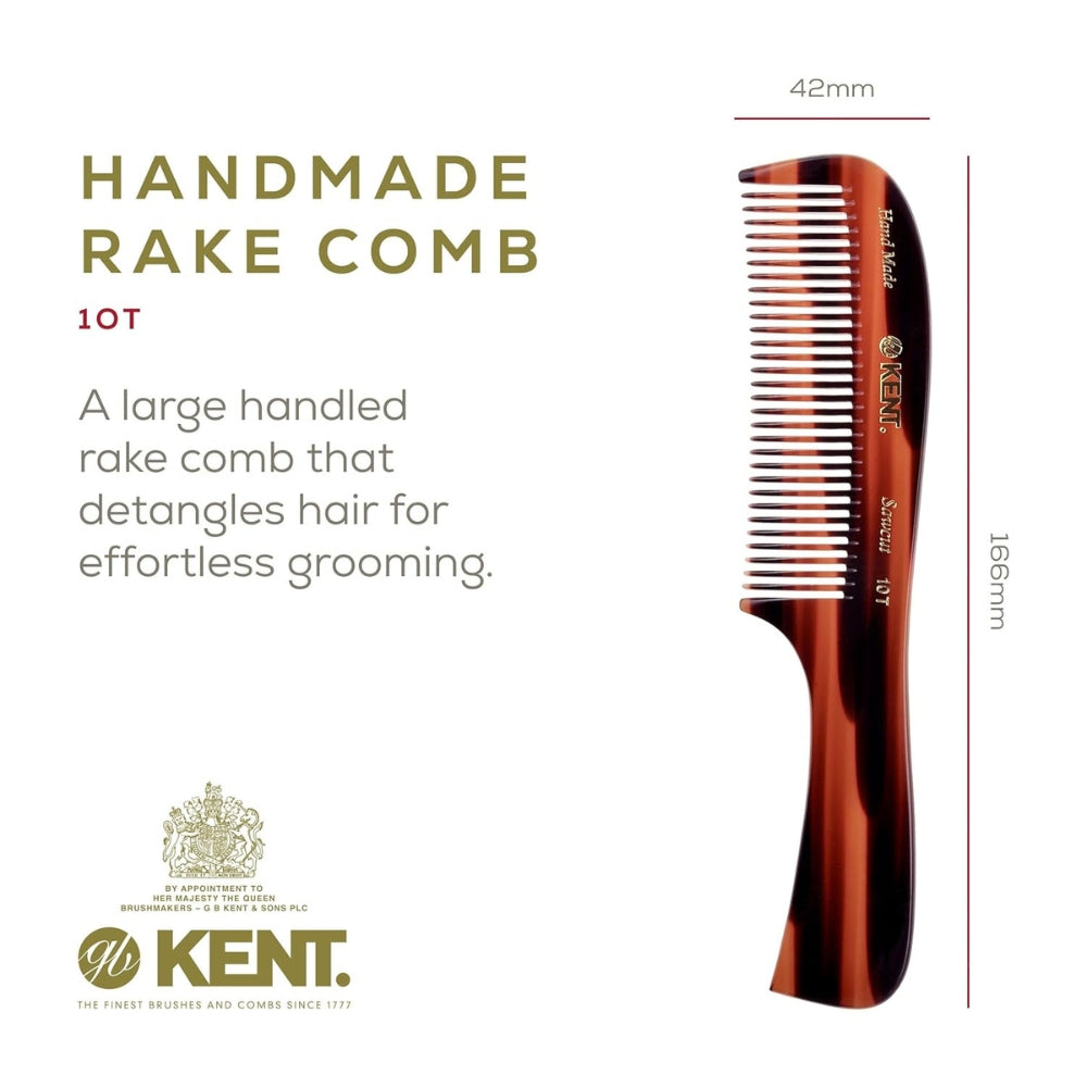 Le peigne à râteau à large manche pour cheveux épais numéro 10T de Kent est fait à la main et ai d'une longueur de 199mm/7.83". Il est fabriqué à partir de grandes feuilles d'acétate de cellulose plutôt que d'être moulé. Ce matériau est tactile, flexible et résistant.