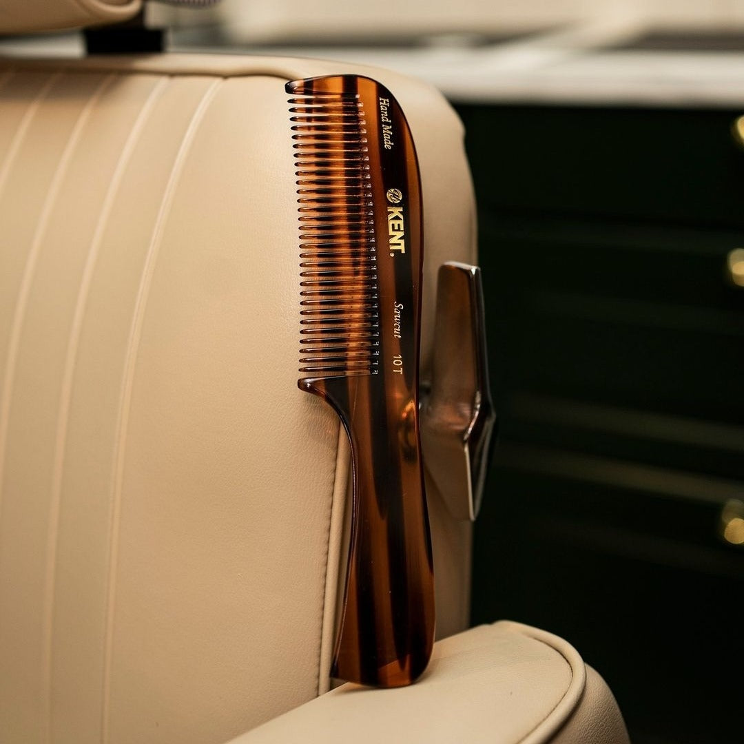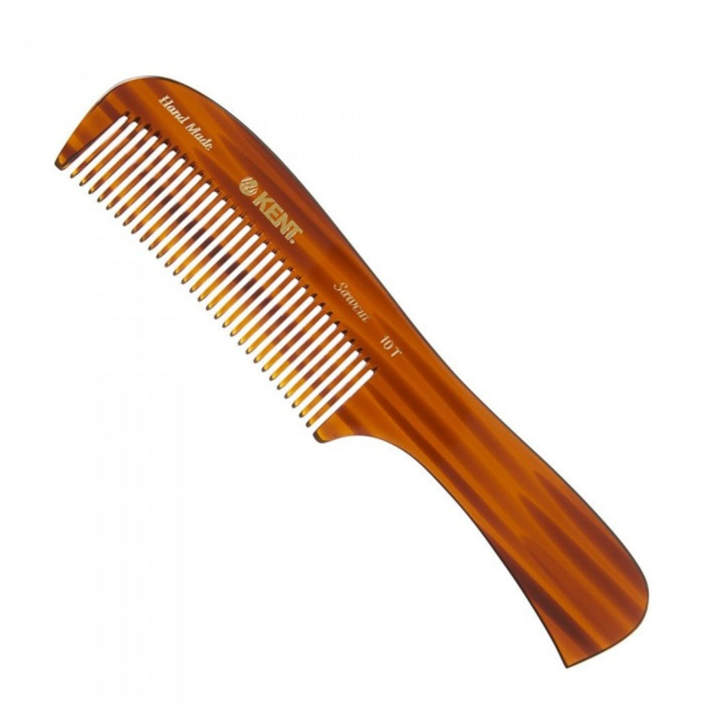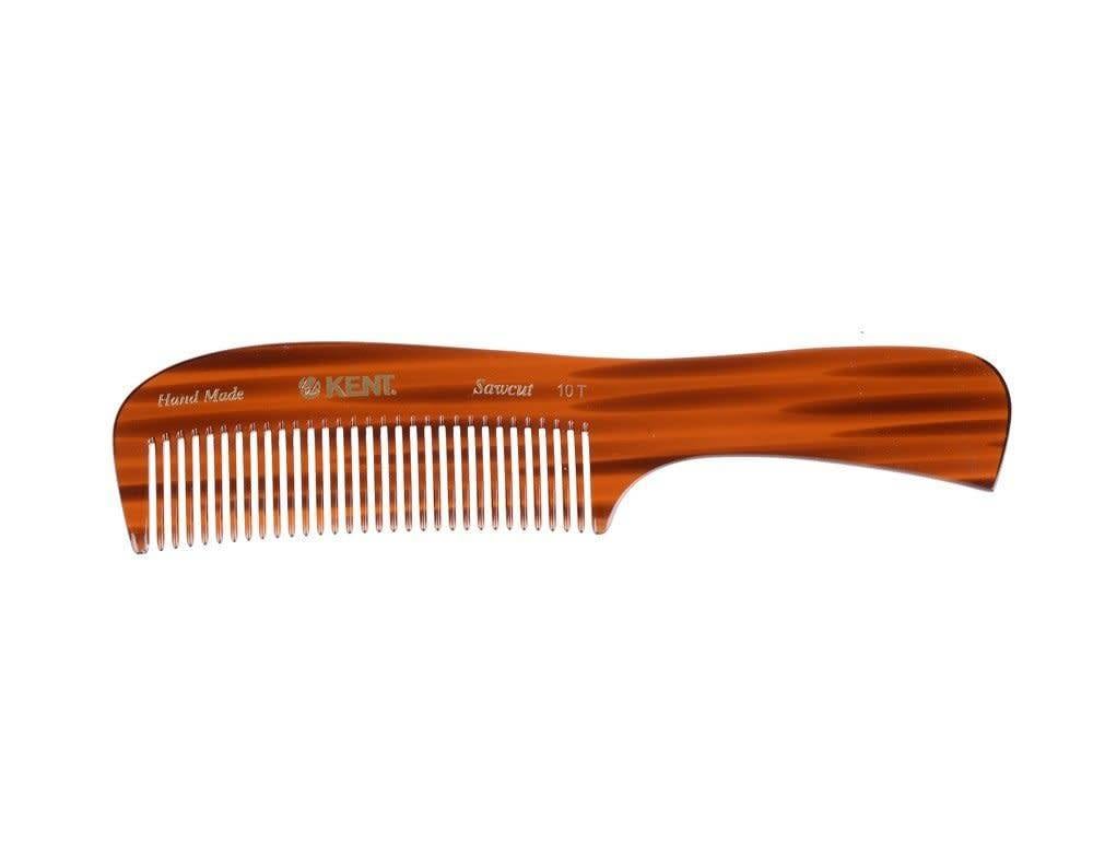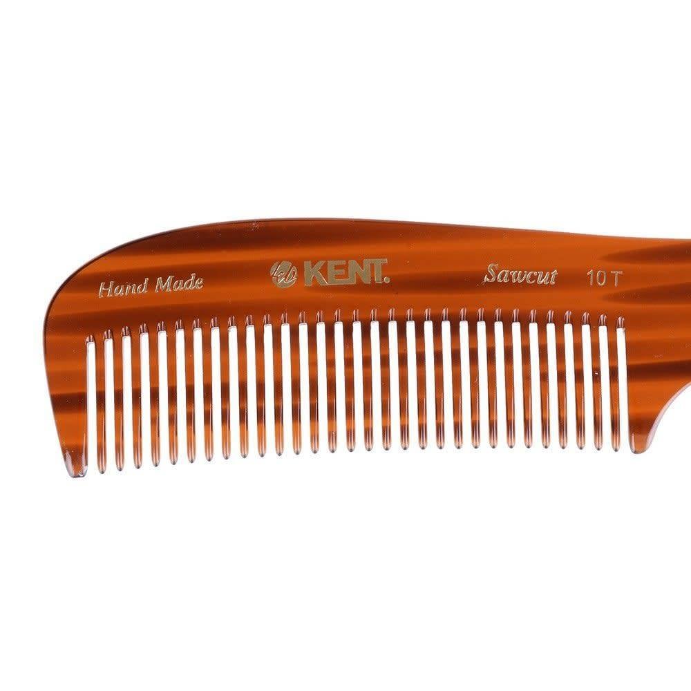 Le peigne à râteau à large manche pour cheveux épais numéro 10T de Kent est fait à la main et ai d'une longueur de 199mm/7.83". Il est fabriqué à partir de grandes feuilles d'acétate de cellulose plutôt que d'être moulé. Ce matériau est tactile, flexible et résistant.
