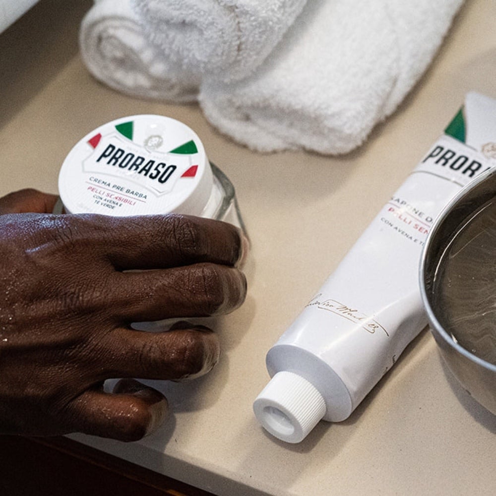 La crème de pré-rasage pour peaux sensibles Proraso prépare et adoucit la peau avant le rasage pour aider à réduire l'irritation et comme un bouclier invisible, elle aide à protéger la peau du rasoir. Formulé avec de l'avoine et du thé vert pour les propriétés apaisantes, calmantes, hydratantes et antioxydantes et présente juste un soupçon de parfum léger et rafraîchissant de citron vert et de pomme.
