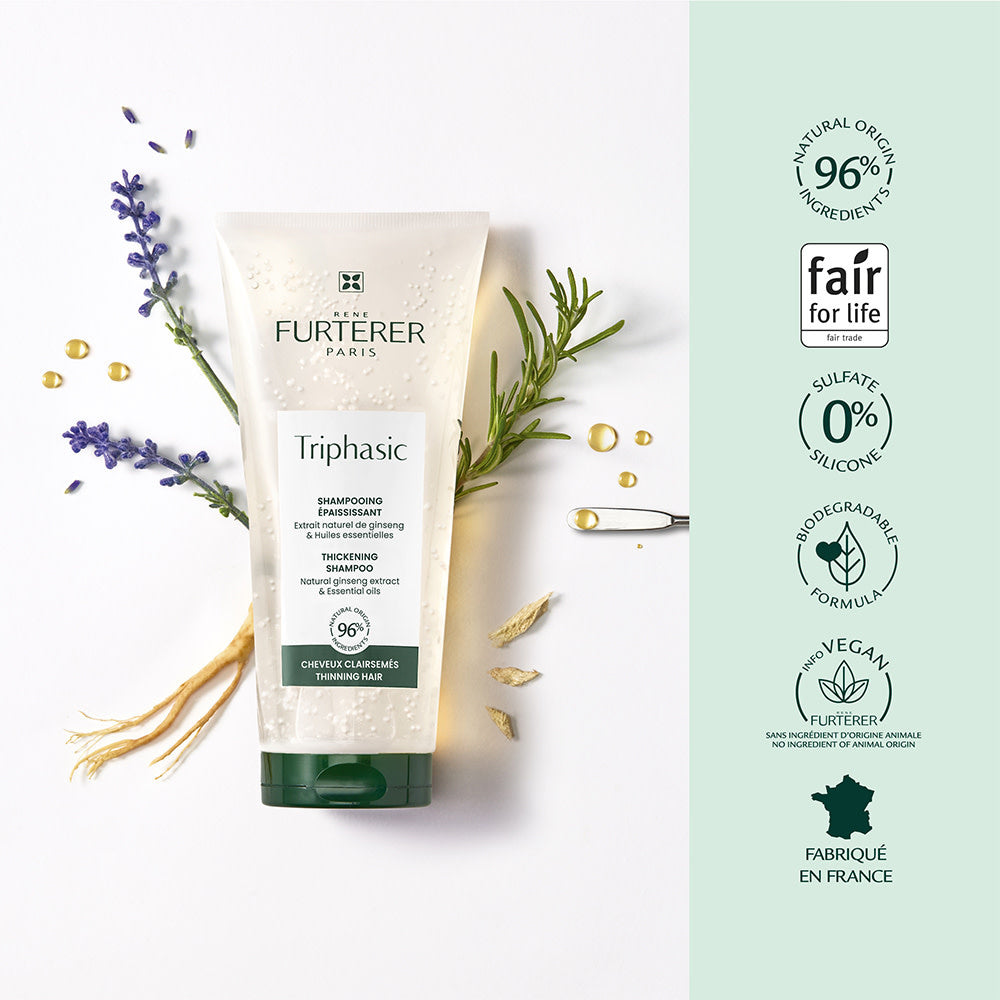 Formulé pour combattre la chute de cheveux, freiner la perte de densité et stimuler la repousse, le shampoing épaississant "Triphasic" de René Furterer est un véritable soin expert du cuir chevelu. Sa formule, riche en actifs naturels, agit en profondeur pour renforcer les racines, revitaliser le cuir chevelu et favoriser une croissance saine des cheveux.