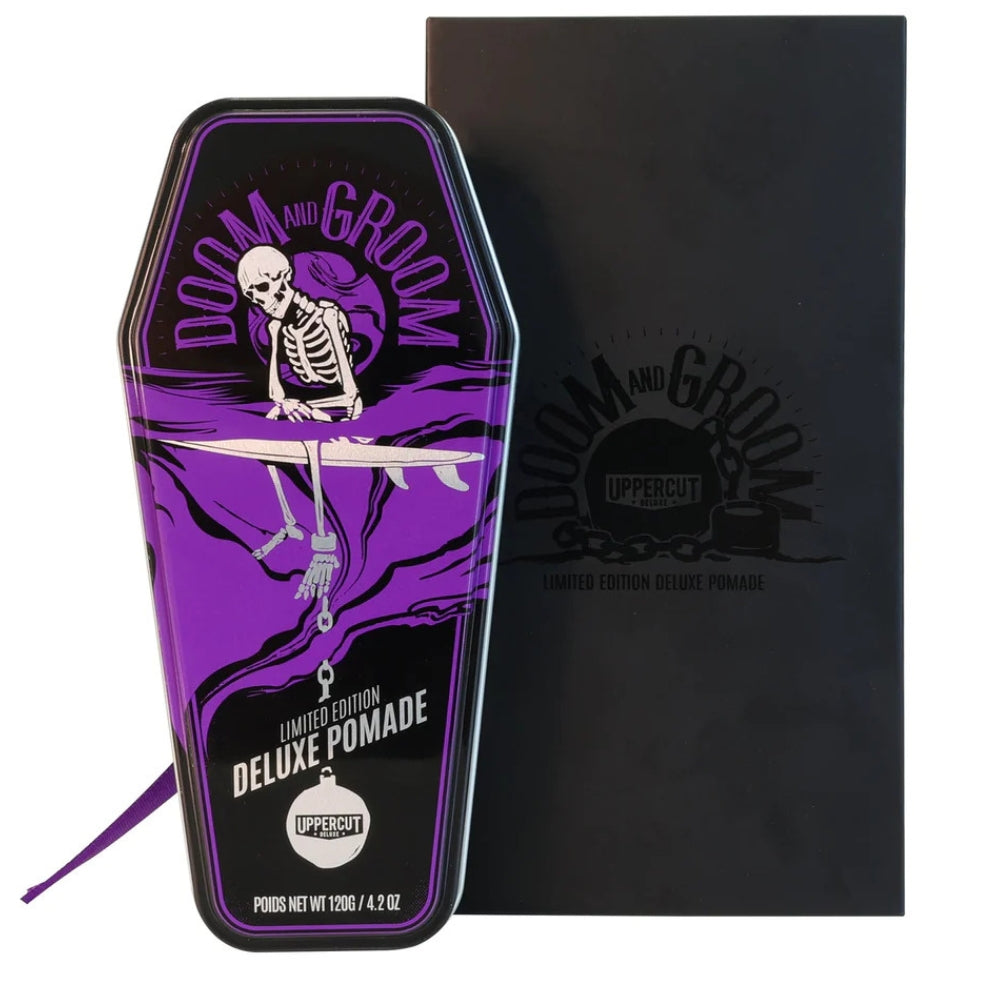 Plongez dans l’univers sombre et stylé de "DOOM & GROOM", une édition limitée signée Uppercut Deluxe. Inspirée par les vagues sauvages, les riffs de Sabbath et l’esprit rebelle du surf australien, cette pommade incarne une esthétique audacieuse et une performance professionnelle. Elle conserve la tenue forte et la brillance maîtrisée de la formule classique Uppercut, tout en se parant d’un parfum exclusif et d’un packaging en forme de cercueil, aussi iconique qu’inattendu.